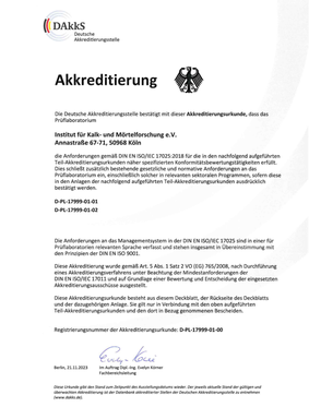 We are a DAkkS accredited testing institute (DIN EN/IEC 17025:2018) for the analysis of construction materials, lime chemistry and aggregates. The IKM acts as a notified body (NB 1546) according to the Construction Products Regulation (No 305/2011). We are recognised both nationally and in Europe: